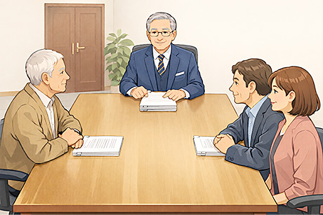 ※ 中央にいる男性が公証人、左にいる男性が遺言者(今回遺言を作成する方)、右にいる2名が証人です。