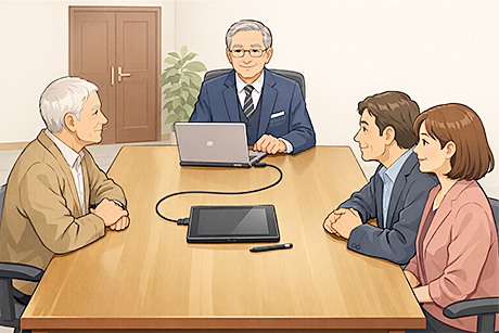 この絵は、電子公正証書遺言の作成現場をイラストにしたものです。